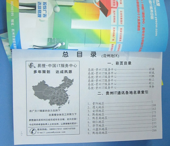 这本书编辑前期由易搜专人到贵州省各市、地方县的IT数码城、路边及大厦挨家挨户进行名片收集,包含有电话,手机、网址、联系人等信息。(QQ版本也可以专门订制,详见易搜商城)