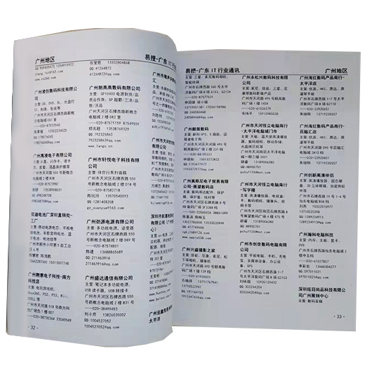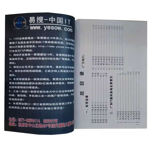 此次的易搜《广东IT行业通讯》封面采用250克铜板纸彩色覆膜精包装印刷,刊头以黄色为主;本书收集了广州、深圳、珠海、汕头、韶关、江门、茂名等21个地级市及周边县市的IT商家信息,内容包括商家电话、手机、联系人、QQ、邮箱、网址等等!!